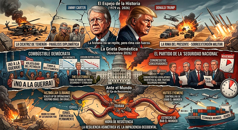 Al final de este ciclo, el paralelismo con 1979 se vuelve inevitable. Jimmy Carter perdió su presidencia porque no pudo liberar a cincuenta y dos estadounidenses; Donald Trump corre el riesgo de truncar su legado y la mayoría parlamentaria por intentar liberar a una región que se resiste a ser moldeada bajo sus términos. La derrota de hoy no se mide solo en bajas militares, sino en la pérdida del control de la agenda interna y en el fortalecimiento de un bloque opositor en Medio Oriente que ahora es más sofisticado, está más armado y tiene menos que perder que hace cuatro décadas. El nuevo Congreso en enero podría heredar las cenizas de una estrategia que, por ignorar las lecciones de la historia, terminó repitiendo sus peores errores.