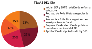 Por otro lado, también destaca en medios que en el tema del conflicto con la Coordinadora Nacional de Trabajadores de la Educación (CNTE), “el límite siempre será el diálogo”, señaló el presidente de la República, Enrique Peña Nieto, quien recalcó que la derogación o abrogación de la reforma educativa no corresponde al Ejecutivo federal.