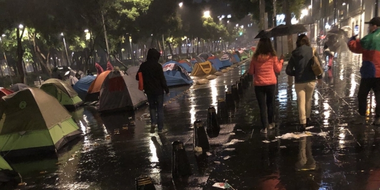 Este fin de semana, FRENAA trató de tomar el Zócalo de la Ciudad de México, pero su paso fue detenido por policías; por esta razón, los manifestantes montaron un campamento en avenida Juárez, entre Paseo de la Reforma y Eje Central.