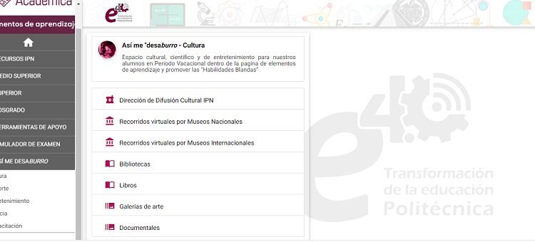 CIUDAD DE MÉXICO.- Para contribuir a que alumnos, docentes y personal de apoyo y asistencia a la educación tengan la oportunidad de consultar múltiples temas de esparcimiento y culturales, durante este periodo de emergencia sanitaria y distanciamiento social por el COVID-19, el Instituto Politécnico Nacional creó la sección Así me Desaburro dentro de la página web elementosdeaprendizaje.ipn.mx/