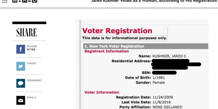 CIUDAD DE MÉXICO, 28 de septiembre (AlMomentoMX).- Jared Kushner, yerno y uno de los principales asesores del presidente Donald Trump, ha estado registrado como mujer en el padrón electoral durante los últimos ocho años, informó la revista Wired.