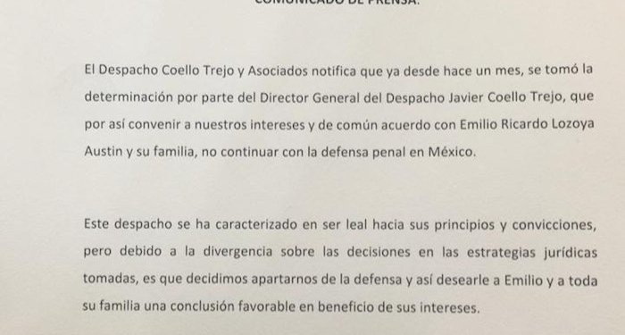 “El despacho Coello Trejo y Asociados notifica que ya desde hace un mes, se tomó la determinación por parte del director general del despacho, Javier Coello Trejo, que por así convenir a nuestros intereses y de común acuerdo con Emilio Lozoya Austin y su familia, no continuar con la defensa penal en México”, indicó el bufete en un comunicado.