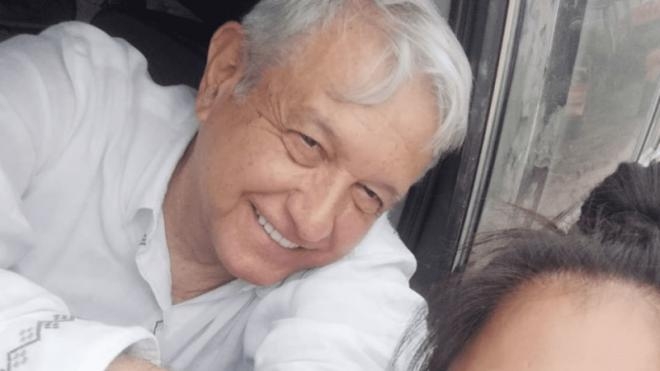 López Obrador viajaba en el asiento del copiloto y por la ventana al escuchar las palabras de Angy solamente alcanza a sonreir.