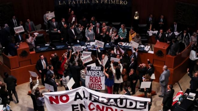 La noche del pasado 12 de septiembre, en la cámara alta, senadores de las fracciones parlamentarias del PAN y Morena, protagonizaron un zafarrancho por la designación de Piedra Ibarra, pues durante el proceso de votación, celebrado el pasado 7 de noviembre, los panistas denunciaron un “fraude” en el conteo de votos para elegir a la nueva ombudsperson.