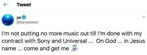 “Necesito ver los contratos de todos en Universal y Sony. No voy a ver cómo esclavizan a mi gente. Estoy arriesgando mi vida por mi gente. La industria de la música y la NBA son barcos de esclavos modernos y yo soy el nuevo Moisés”, redactó en otro tuit.