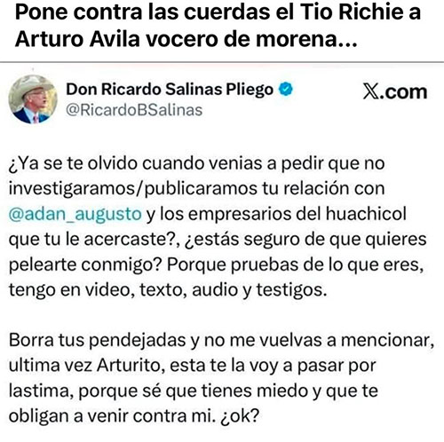 No son figuraciones, les comparto el Twitter de Ricardo Benjamín Salinas Pliego para dar un estate quieto a Arturo Ávila. Los muestra como son: