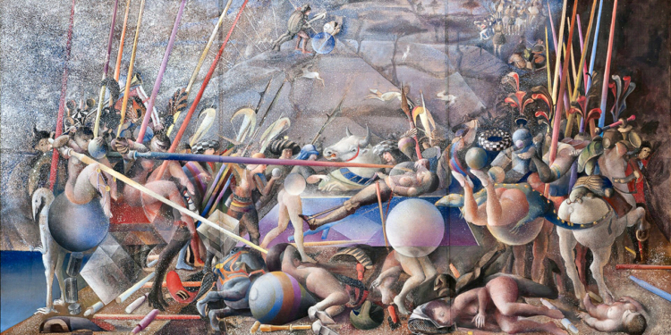 En esos años pude ver cómo trabajaba en uno de los trípticos de “Las batallas de Ucello”, sin duda, una de sus obras más importantes. Lo veía trabajar en el taller de la casa del cineasta Nicolás Echevarría. “Pocos son los que pueden narrar una batalla. Los que mueren, porque han callado y los que sobreviven, porque en ellos el olvido afina sus dientes y todo lo devora. Una batalla es un girar vertiginoso de milanos. Es como un navío en desorden que revuelve las aguas y pierde el rumbo”, como describió Álvaro Mutis respecto a esa obra en donde Arnaldo pudo plasmar una imaginaria después de haber transformado las batallas medievales de Paolo Uccello (1397-1475), en un zoológico fantástico que vemos y volvemos a ver sorprendidos, sin saber lo que quiso decir al plasmar toda esa imaginaria que anda por ahí, incluyendo “la mujer y su tropa de monstruos encantadores y terribles”, de tal manera que fuéramos nosotros los que asociáramos su imaginaria con la propia.