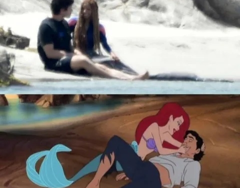 La escena en cuestión parece retomada directamente de La Sirenita, el clásico animado de 1989, ya que Ariel está sentada sobre la arena tratando de reanimar al Príncipe Eric, probablemente después de quedar a la deriva por un naufragio.