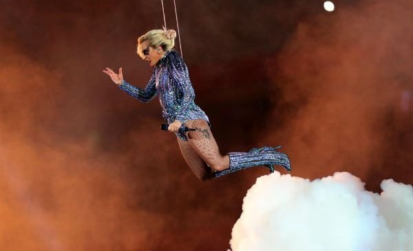 La cantante se lanzó desde el techo del Gillete Stadium de Houston en una espectacular actuación donde no quedaron fuera sus hits ‘Poker Face’ y ‘Bad Romance’
