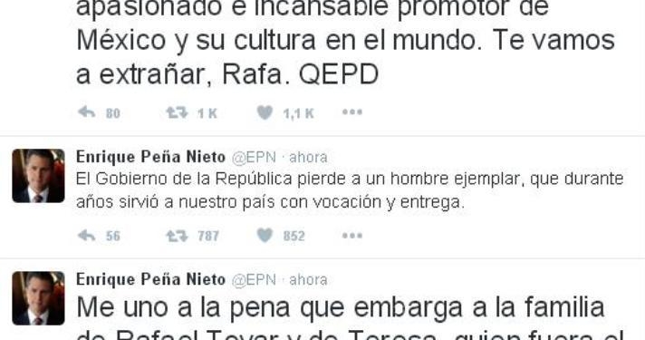 “Me uno a la pena que embarga a la familia de Rafael Tovar y de Teresa, quien fuera el primer Secretario de Cultura y un gran ser humano”, escribió en su cuenta de Twitter @EPN.