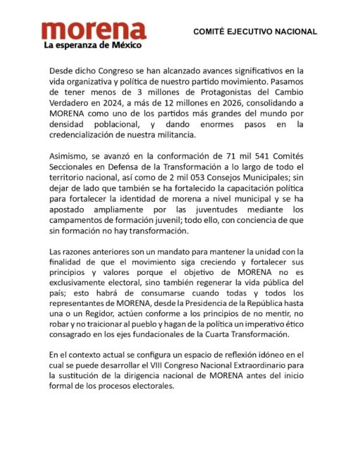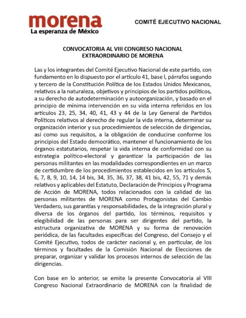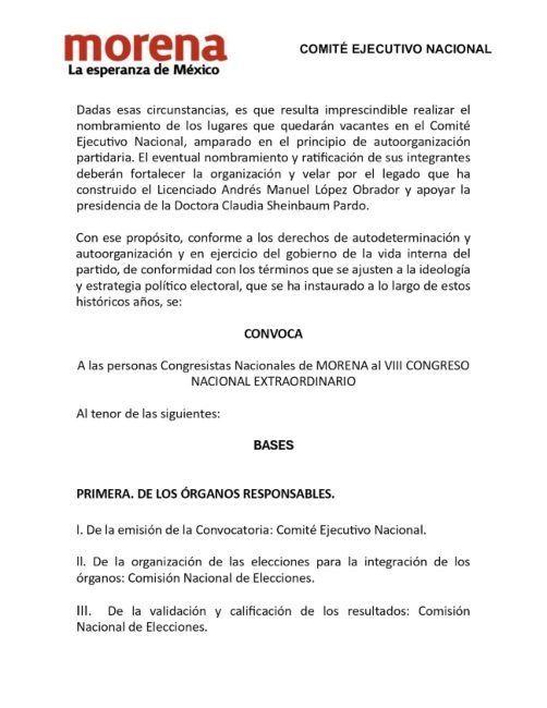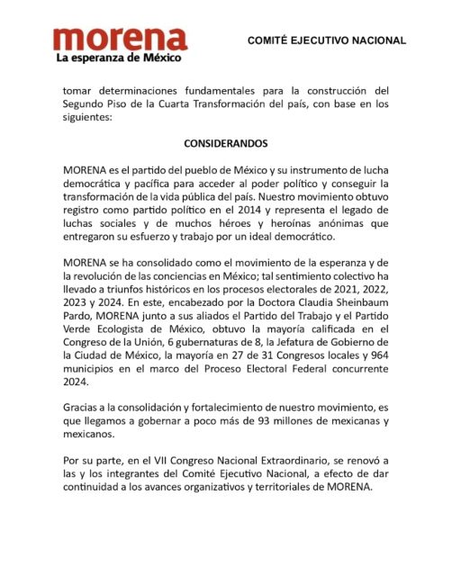 Considera que “dadas esas circunstancias, es que resulta imprescindible realizar el nombramiento de los lugares que quedarán vacantes en el Comité Ejecutivo Nacional, amparado en el principio de auto organización partidaria. El eventual nombramiento y ratificación de sus integrantes deberán fortalecer la organización y velar por el legado que ha construido Andrés Manuel López Obrador y apoyar la presidencia de Claudia Sheinbaum Pardo”.