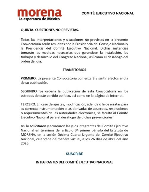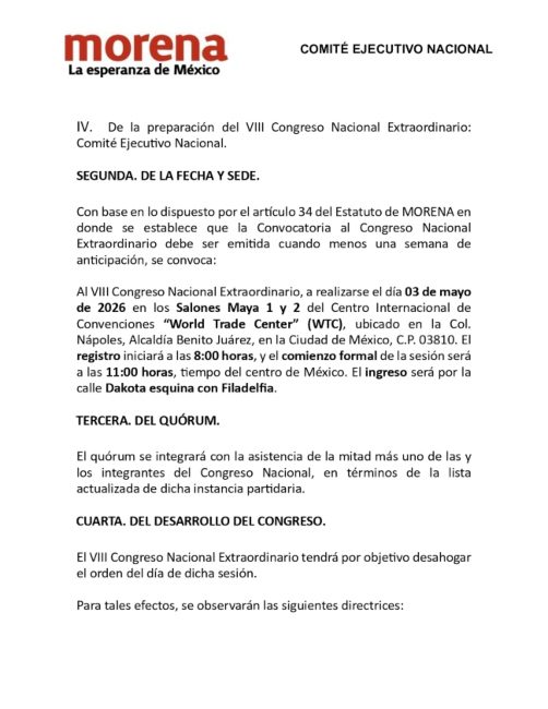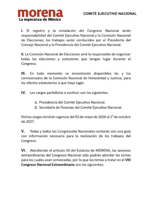 CIUDAD DE MÉXICO.- El partido Morena publicó la convocatoria para su Congreso Nacional del próximo 3 de mayo, en el que elegirá al relevo de Luisa María Alcalde y también designará un nuevo encargado de Finanzas.