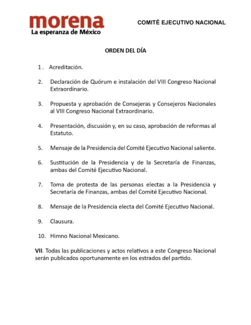 En la convocatoria, Morena señaló que hay un “mandato para mantener la unidad con la finalidad de que el movimiento siga creciendo y fortalecer sus principios y valores porque el objetivo de Morena no es exclusivamente electoral, sino también regenerar la vida pública del país; esto habrá de consumarse cuando todas y todos los representantes de Morena desde la Presidencia de la República hasta una o un Regidor, actúen conforme a los principios de no mentir, no robar y no traicionar al pueblo y hagan de la política un imperativo ético consagrado en los ejes fundacionales de la Cuarta Transformación”.