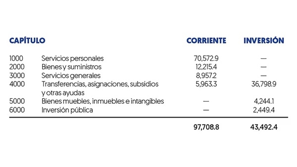 De acuerdo a la clasificación económica y por objeto del gasto, la Sedena contó con un presupuesto ejercido de 141 mil 201.2 millones de pesos en 2022, en la que se destacan los Servicios Personales de Capítulo 1000 e Inversiones.