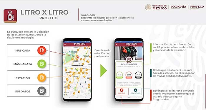 CIUDAD DE MÉXICO, 2 de julio (AlMomentoMX).— La Procuraduría Federal del Consumidor (Profeco) presentó Litro x Litro, una app para buscar gasolineras cercanas y conocer sus precios, así como presentar quejas ante la dependencia.