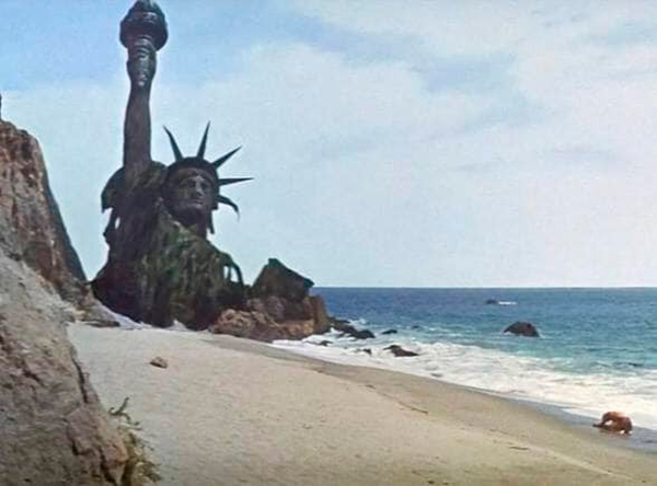 El astronauta George Taylor (Heston) camina por un planeta desolado sin saber realmente donde está. De pronto se encuentra con un trozo de la icónica Estatua de la Libertad semienterrada en una playa. Es entonces cuando se da cuenta de que ese planeta destruido y en control de simios es la Tierra. Su Tierra.