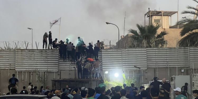Vídeos publicados en internet mostraban a los manifestantes en la sede diplomática ondeando banderas y carteles con la efigie del influyente clérigo chiíta iraquí Muqtada Sadr, informó la agencia AP.