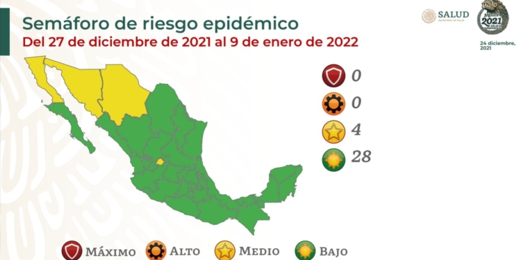 CIUDAD DE MÉXICO.— La Secretaría de Salud federal informó que para las próximas dos semanas [del 27 de diciembre de 2021 al 9 de enero de 2022], 28 estados de las República cerrarán el año en semáforo verde, mientras que cuatro estados estarán en riesgo medio (o amarillo).