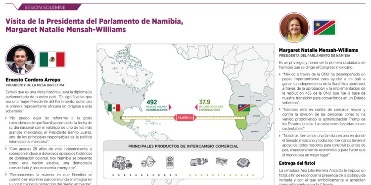 El senador Ernesto Cordero Arroyo, presidente de la Mesa Directiva del Senado de la República, afirmó que México y Namibia somos aliados en la promoción de un orden internacional que permita a nuestras naciones avanzar hacia la prosperidad, queremos que las mujeres y los hombres caminemos juntos hacia el desarrollo.