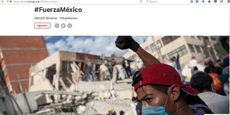 CIUDAD DE MÉXICO, 22 de septiembre (AlmomentoMX).- La plataforma de activismo digital llamada change.org informó que México generó el pico más alto en firmas con una petición de que los políticos del país donen sus dinero a los damnificados del terremoto que azotó a México el pasado martes.