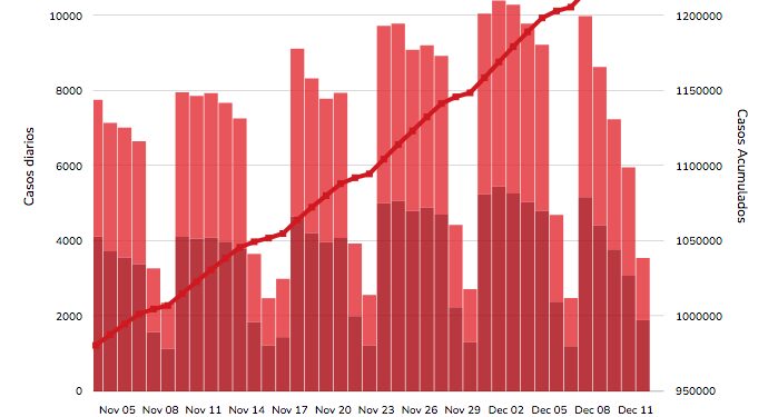 13 de diciembre, 2020 (AMX) Este domingo autoridades sanitarias actualizaron el reporte del número de contagios, e indicaron que se elevó en 12,057 respecto al día de ayer, para ubicarse en un millón 241,436 de contagios. Esta cifra se da un día después que el gobierno de México aprobó la vacuna fabricada por la farmacéutica estadounidense Pfizer y por su socia alemana BioNTech.