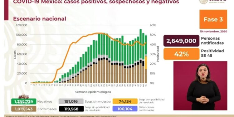 ⇒ En el reporte de este jueves 19 de noviembre, México acumuló 1 millón 19 mil 543 contagios confirmados desde el 28 de febrero, cuando se confirmó el primer caso.