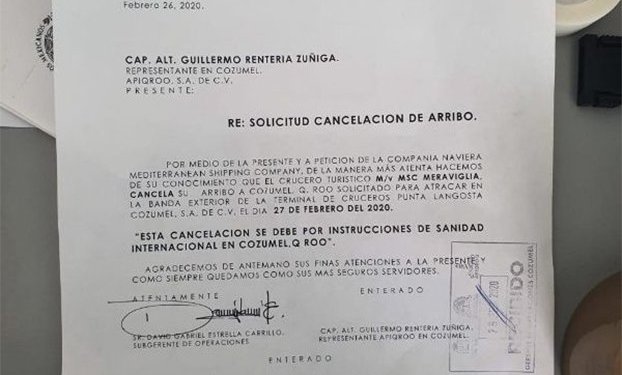 En tanto, el crucero MCS Meraviglia canceló su solicitud de atraque en Cozumel —previsto para este 27 de febrero—, debido a “instrucciones de sanidad internacional en Cozumel”.