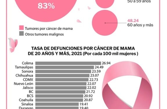 A nivel nacional, la tasa de mortalidad por cáncer de mama en el país durante el año pasado fue de 18 defunciones por cada 100 mil mujeres (de 20 años y más). Los estados con las tasas más altas fueron: Colima (26.94), Tamaulipas (24.49), Sonora (23.59), Chihuahua (23.07) y Ciudad de México (22.73). Mientras que Tlaxcala (10.36), Chiapas (11.65), Guerrero (11.69), Quintana Roo (12.19) y Oaxaca (12.66) reportaron las tasas más bajas.