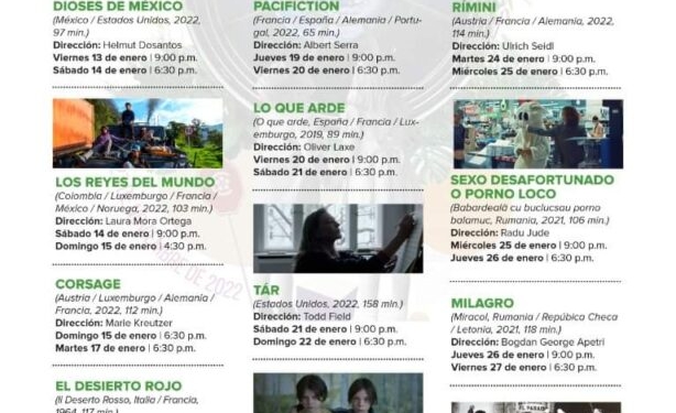 Del 13 al 28 de enero, en la Sala 1 de la Cineteca (A. Fundidora S/N, Col. Obrera, Monterrey, N.L.), se proyectarán películas de países como Austria, Francia, Colombia, Estados Unidos, Rumanía, México, con titulos cómo Pacifiction, Milagro, Playground un mundo, Los Caifanes y varios más.