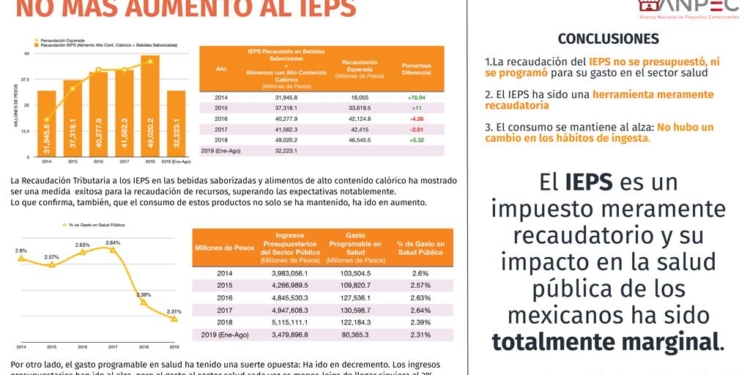 La Alianza Nacional de Pequeños Comerciantes (ANPEC) hace un llamado a la mayoría legislativa a que honren el compromiso presidencial de no aumentar los impuestos para 2020, “ya que la actualización del IEPS, es en sí misma un incremento de contribución que pondrá en mayores aprietos la calidad de vida de los consumidores mexicanos, que viven al día por sus bajos ingresos”, aseguró Cuauhtémoc Rivera, líder de ANPEC.