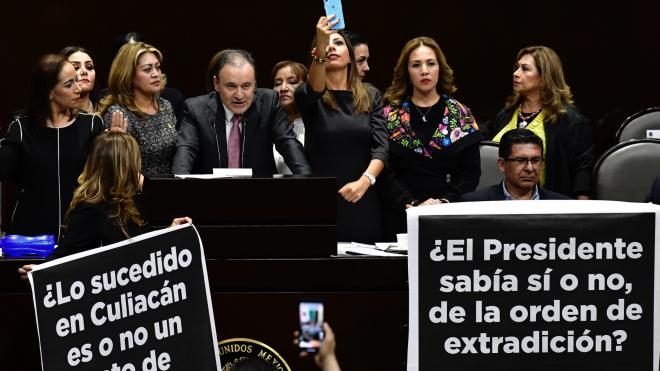 En la segunda mitad de la comparecencia de Alfonso Durazo, secretario de Seguridad Pública, ante los diputados federales, el PAN, como al inicio de la comparecencia, tomó la tribuna y desplegó en pancartas cada uno de los cuestionamientos sobre el operativo del 17 de octubre en Culiacán, Sinaloa, según informó apro.