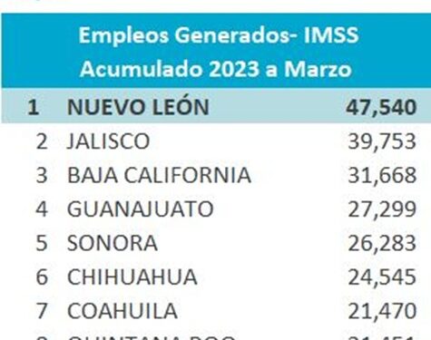 El estado de Nuevo León ocupa el primer lugar en creación de empleos con las cifras acumuladas de enero a marzo de este año, de acuerdo con datos del IMSS.