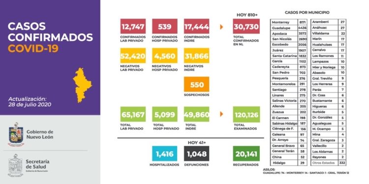 NUEVO LEÓN.- La Secretaría de Salud de Nuevo León reportó que al corte de ayer el estado registro 810 casos nuevos de coronavirus, mismos que ya han rebasado los 30 mil contagios en la entidad durante la pandemia.