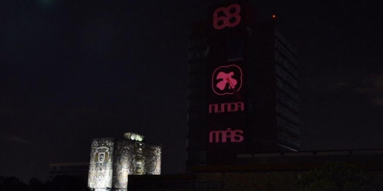 La noche del lunes 1 de octubre, la Máxima Casa de Estudios apagó las luces del edificio de Rectoría y proyectó en su fachada el mensaje “Nunca Más”. En la parte superior del edificio sobresalía el número 68, un poco más abajo yacía la paloma de la Paz atravesada por la punta de una Bayoneta.