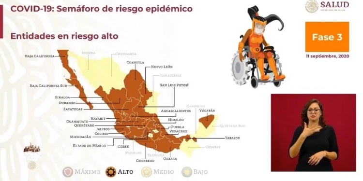De acuerdo con el Semáforo de Riesgo Epidemiológico, no hay ningún estado de la República en color rojo de la alerta sanitaria. La mayoría de las entidades en el país se ubican en color naranja y algunas en color amarillo.