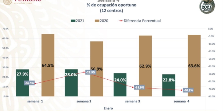 CDMX.- El secretario de Turismo del Gobierno de México, Miguel Torruco Marqués, informó que durante la cuarta semana del 2021 -del lunes 25 al domingo 31 de enero- la ocupación hotelera general registró un promedio de 22.8 por ciento; lo que equivale a 1.2 puntos porcentuales menos que la semana previa.