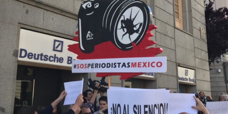 En España, un grupo de periodistas se concentró a las puertas de la embajada de México en Madrid para expresar su indignación ante los ataques a la prensa mexicana.