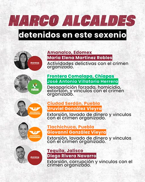 La infografía que circula con los nombres de al menos cinco alcaldes detenidos en lo que va del sexenio no es sólo un recuento policial: es el mapa visible de una red que durante años se normalizó bajo el disfraz de la política local. Amanalco, Frontera Comalapa, Ciudad Serdán, Tlachichuca y Tequila no son casos inconexos; son eslabones de un mismo patrón: autoridades municipales capturadas por el crimen organizado, ya sea por complicidad, por omisión o por franca asociación.