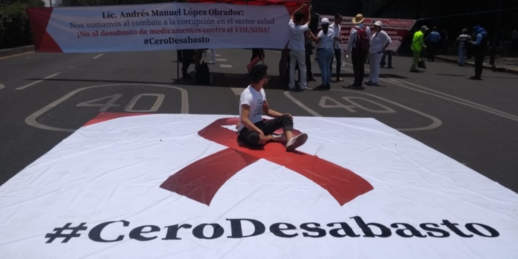 Personas integrantes del Movimiento Nacional de lucha contra el #VIH y Sida, se manifiestan frente a las instalaciones de la @SSalud_mx en la Ciudad de México por el #desabasto de #Medicamentos #antirretrovirales pic.twitter.com/cx0aBZUV99