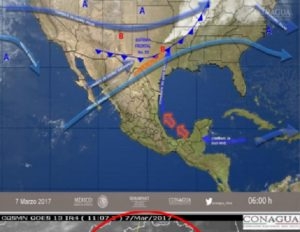 Los vientos y la lluvia son generados por el Frente Frío Número 33, localizado en el norte y el noreste de México, y por un canal de baja presión ubicado en Tamaulipas y Veracruz.