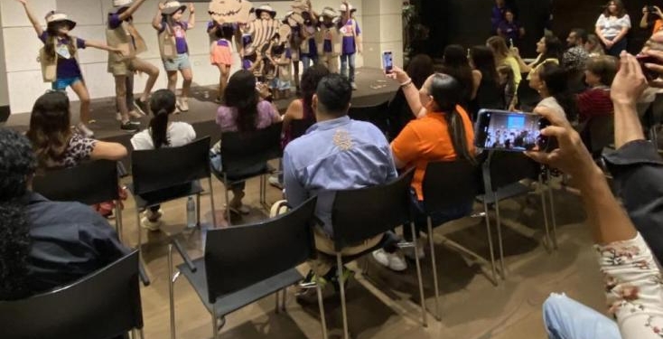 El siguiente grupo lo formaron las y los paleontólogos de 8 a 10 años, quienes ilustraron a los presentes sobre la Era Mesozoica ataviados con sombreros y chalecos explicaron la mítica figura del Monstruo de Aramberri, el enorme reptil marino encontrado en Formación La Casita al sur del estado; las cosas no quedaron ahí, de pronto en el escenario, sus herramientas: cámaras, cinta de medir, martillos y brochas, hicieron un baile frenético y divertido.