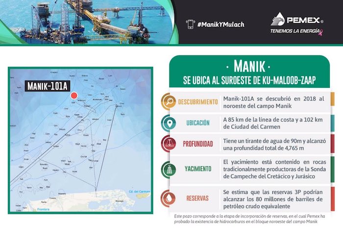En conferencia de prensa, el director de Pemex, Carlos A. Treviño, indicó que se trata de siete yacimientos en dos áreas: Manik 101-A, con dos yacimientos y un potencial de 80 millones de barriles, se encuentra a 102 kilómetros de Ciudad del Carmen (Campeche) y fue descubierto en abril con una profundidad total de 4 mil 765 metros.