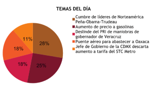 CIUDAD DE MÉXICO, 30 de junio (Almomento Noticias/Intelicast).- Entre las noticias principales que se publican en los medios de comunicación, de acuerdo con el monitoreo informativo realizado por Intelicast, se encuentra que los presidentes de México, Enrique Peña Nieto, y Estados Unidos, Barack Obama, y el primer ministro de Canadá, Justin Trudeau, acordaron una alianza histórica para lograr la meta de producir el 50 por ciento de su energía eléctrica a través de fuentes limpias para 2025.