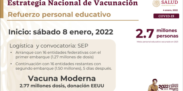 “El 8 de enero arrancará la aplicación de dosis de refuerzo en personal educativo, con 2.7 millones de la vacuna Moderna, son 2.77 millones que forman parte de una donación de Estados Unidos, con el primer embarque de 1.7 millones arrancará la vacunación en 16 entidades y con el segundo embarque, de 1.5 millones que llegará 5 días después, se vacunará en las otras 16 entidades”, apuntó.