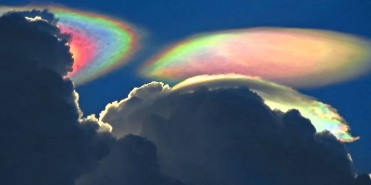 Las nubes iridiscentes se pueden ver cuando la luz solar sufre una difracción por diminutas partículas de agua que tienen las nubes provocando que éstas proyecten colores en tonos llamativos.