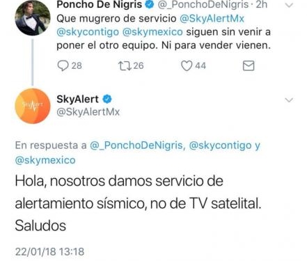 Al percatarse de este mensaje, Sky Alert le contestó al conductor: “Hola, nosotros damos servicio de alertamiento sísmico, no de TV satelital. Saludos”.