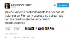 A través de la cuenta de Twitter @EPN, el mandatario escribió: “México lamenta profundamente los hechos de violencia en Florida, y expresa su solidaridad con las familias afectadas y pueblo estadounidense”.