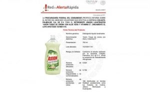CIUDAD DE MÉXICO, 11 de octubre (AlMomentoMX).- La Procuraduría Federal del Consumidor (Profeco) recomendó suspender de inmediato el uso del lavatrastes ‘Axión’ toque de crema con Aloe y Vitamina E, envasado el pasado 19 de agosto bajo el lote de fabricación 7231MX111H.