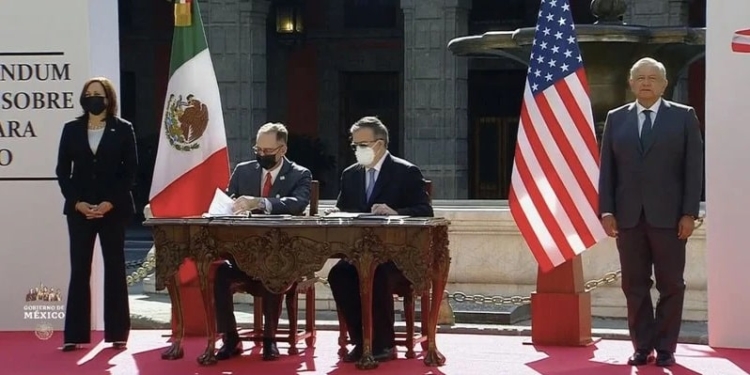 Durante la ceremonia de recepción, el canciller Marcelo Ebrard firmó un acuerdo con el representante de Estados Unidos para impulsar el desarrollo en el triángulo norte, con el fin de mitigar el problema de la migración.