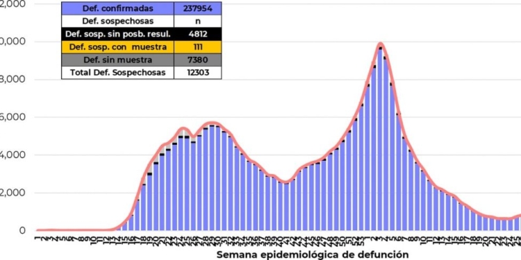 CIUDAD DE MÉXICO.- La Secretaría de Salud dio a cono cer que al corte de información del 23 de julio, se registraron 237,954 defunciones totales de COVID-19. Hasta el día de hoy, se tienen 12,303 defunciones sospechosas de COVID-19 que incluyen las pendientes por laboratorio y las que están en proceso de asociación- dictaminación clínica – epidemiológica en SISVER.